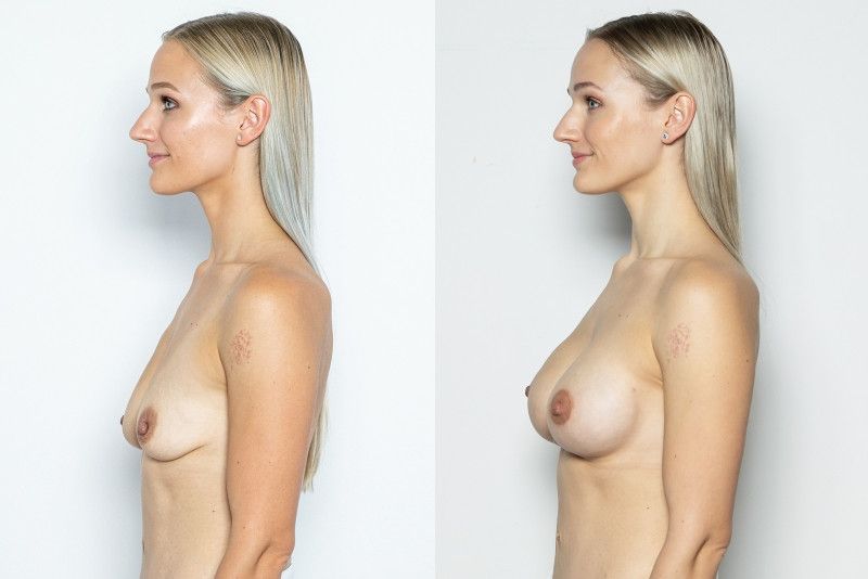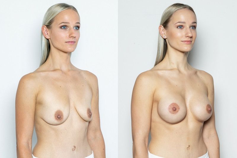 Frau Radka wünschte sich ein volles, straffes Aussehen ihrer Brüste zurück, das sie durch das Stillen verloren hatte. Wir haben ihre Brüste mit in Deutschland hergestellten Silikonimplantaten vergrößert und sie mit unserer originellen Technik der "Innerbra"-Methode gestrafft. So ist sichergestellt, dass das schöne Vergrößerungsergebnis viele Jahre lang erhalten bleibt. Gleichzeitig haben wir die leichte Asymmetrie der Brüste durch die Zugabe von Eigenfett gelöst. Dieses wurde durch eine schonende Fettabsaugung an den Oberschenkeln gewonnen.